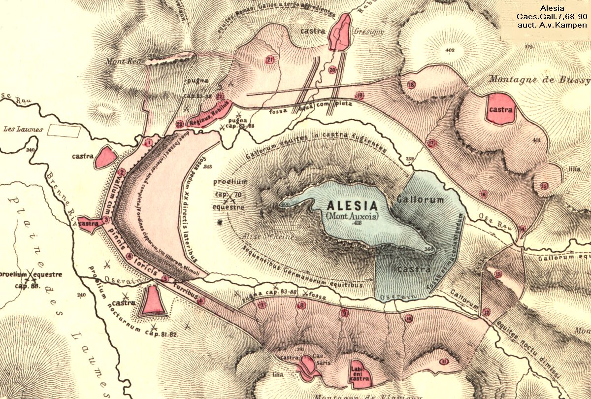 (69,1) Ipsum erat oppidum Alesia in colle summo admodum edito loco, ut nisi obsidione expugnari non posse videretur. (69,2) cuius collis radices duo duabus ex partibus flumina subluebant. (69,3) ante oppidum planities circiter milia passuum III in longitudinem patebat; (69,4) reliquis ex omnibus partibus colles mediocri interiecto spatio pari altitudinis fastigio oppidum cingebant. Alesia wird auf zwei Seiten [Nord, Süd] von Flüssen umschlossen. Vor dem Oppidum liegt [im Westen] eine Ebene von ca. 4 bis 5 km. Überblicke: