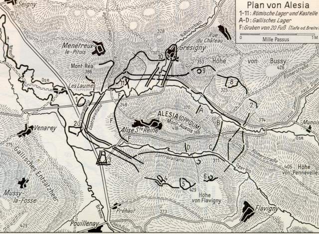 (69,6) eius munitionis, quae ab Romanis instituebatur, circuitus X milia passuum tenebat. (69,7) castra opportunis locis erant posita itemque castella XXIII facta, quibus in castellis interdiu stationes ponebantur, ne qua subito eruptio fieret; haec eadem noctu excubitoribus ac firmis praesidiis tenebantur. Die Befestigungsanlage der Römer misst 10.000 Doppelschritte (= 10 Meilen / 15 km). Caesar lässt im Umkreis von Alesia 23 Kastelle bauen.