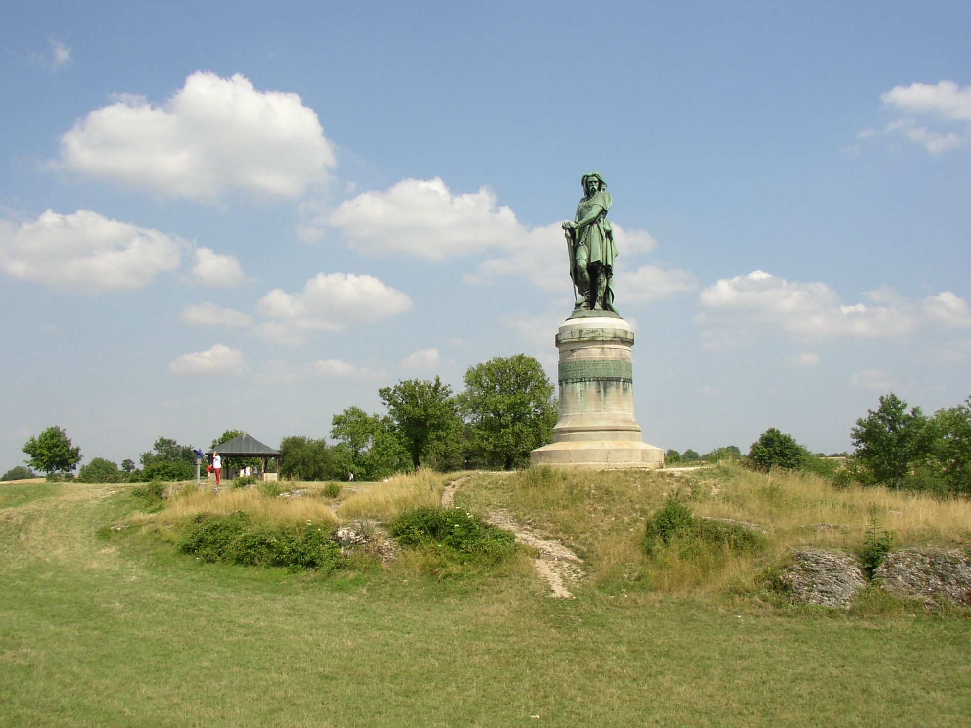 (70,1) Opere instituto fit equestre proelium in ea planitie, quam intermissam collibus tria milia passuum in longitudinem patere supra demonstravimus. summa vi ab utrisque contenditur. (70,2) laborantibus nostris Caesar Germanos submittit legionesque pro castris constituit, ne qua subito inruptio ab hostium peditatu fiat. (70,3) praesidio legionum addito nostris animus augetur ... In der Ebene treffen die Reiter aufeinander, den Römern helfen die germanischen Reiter. Die Ebene vor Alesia: