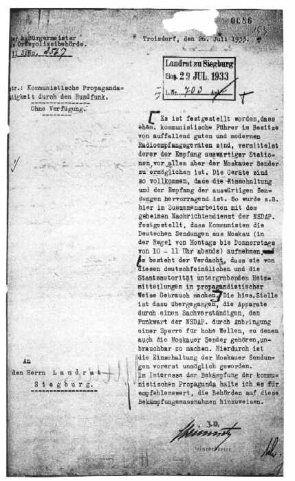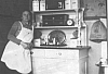 Frau Wally G. vor dem bewussten Radio; es besteht aus zwei dunklen Kästen, die im Küchenbord neben Zucker und Sago verstaut sind (Aufnahme 1934). Die NSDAP hat es 1933 manipuliert, damit die "Moskauer Sendungen" nicht mehr empfangen werden konnten.