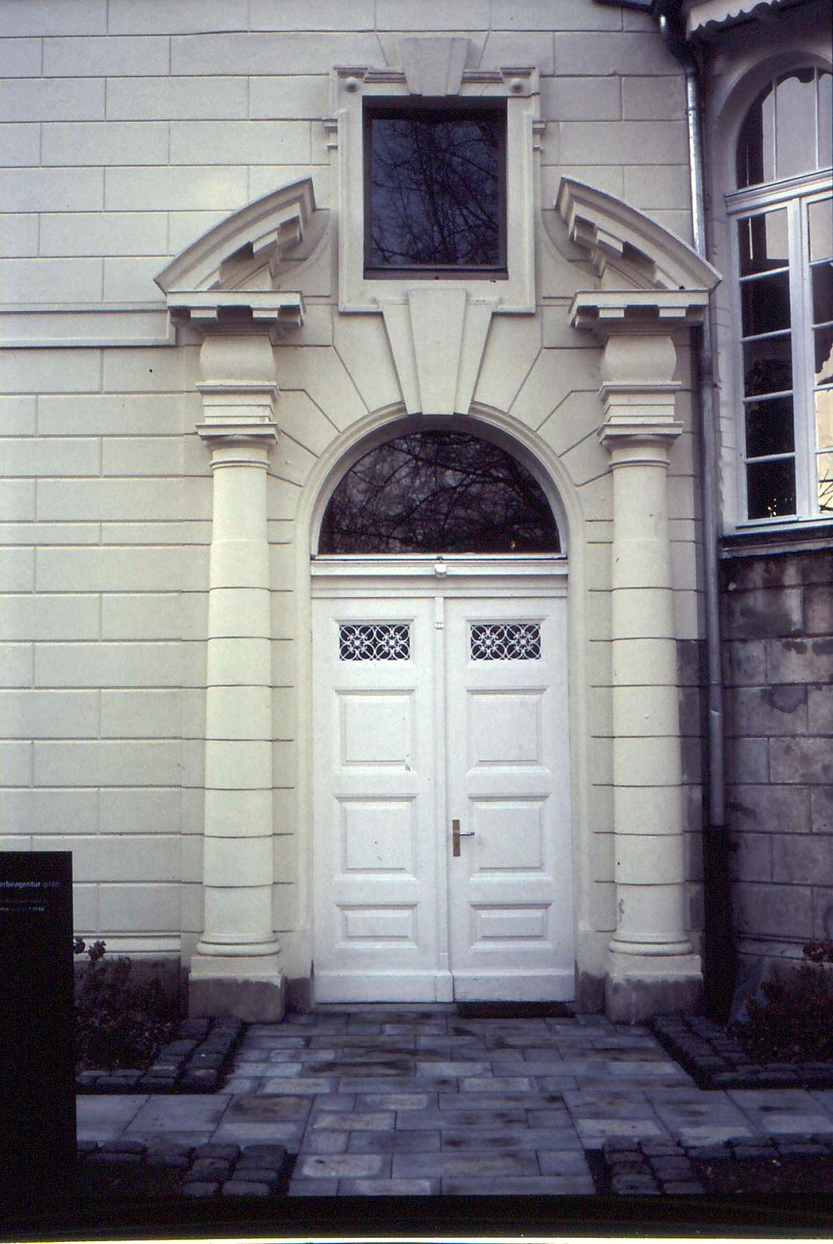 Der Dreiecksgiebel ist mit einem Zahnfries, der eine antikisierte, vollplastische Büste einrahmt, ausgeschmückt.