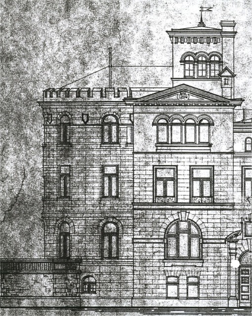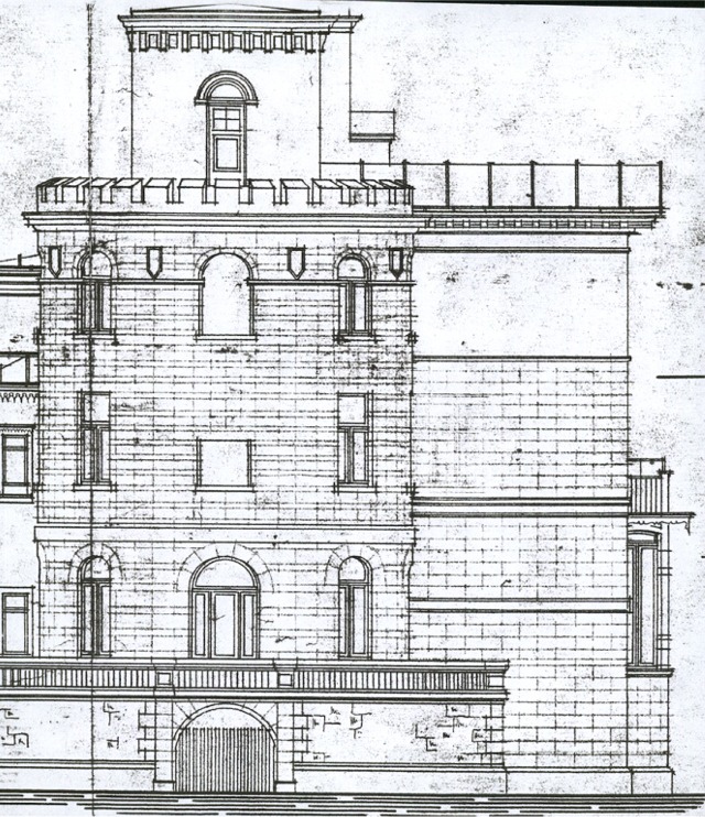 unverändert 1940 vermerkt die Zeichnung ausdrücklich, dass das Haus (mit Turm) Wohnraum für sechs Familien bietet. |